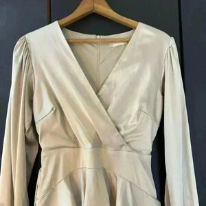 Elegant cream dress with long sleeves. Features a wrap-style front and tiered ruffle hem. Perfect for special occasions.