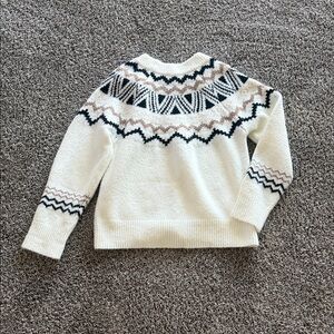 Stay warm and stylish with this cozy cream sweater featuring a chic black and tan pattern. Perfect for any casual outing. Love this sweater, just too small for me!