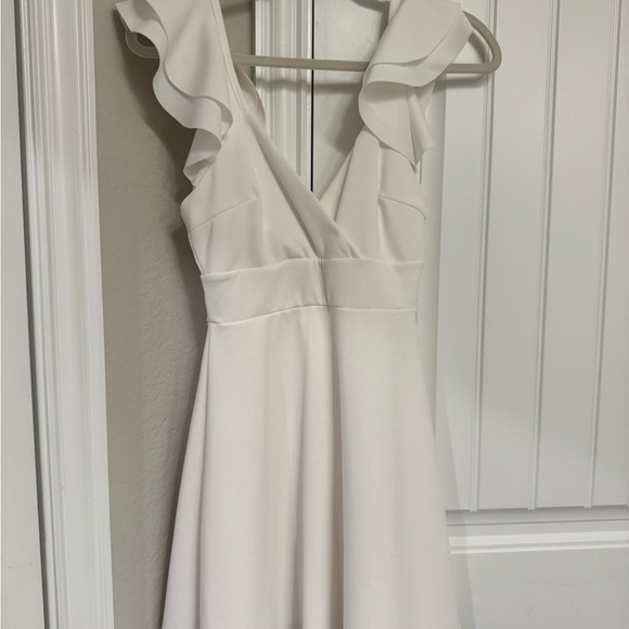 Chic mini dress with ruffle sleeves. V-neckline and fitted waist. Ideal for stylish outings.