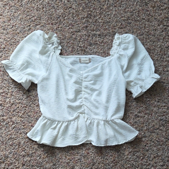 Chic cream blouse with ruffled sleeves. Features a ruched front and peplum hem. Perfect for casual outings.