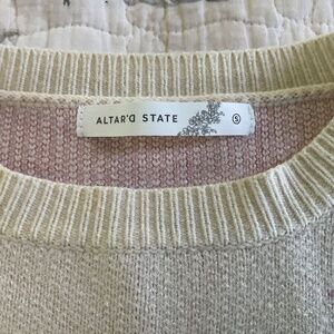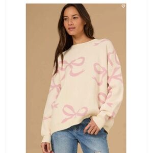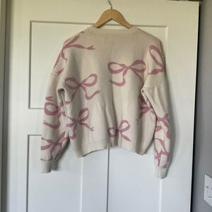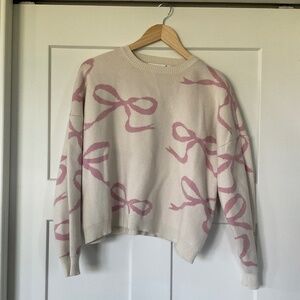 Altar'd State Cream and Pink Crew Neck Sweater with Bow Pattern Small