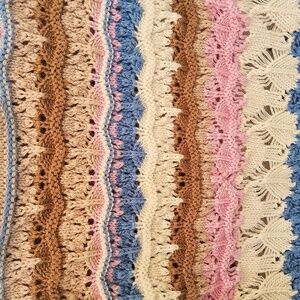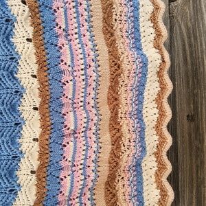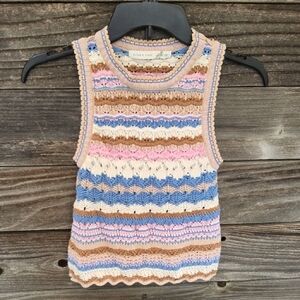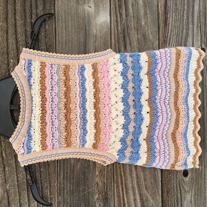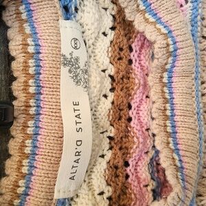 Altar'd State knit top, size XXS, 100% cotton, beautiful blue , pink and brown crocheted pattern, excellent condition, approx 18 inches in total length, festival, Stagecoach, Coachella , summer top