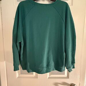 crochet detailing, oversized fit, emerald green, textured knit, boho style, cozy sweatshirt, pastel shade, thermal fabric, casual wear, layered look