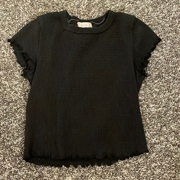 Size small. This is a great basic black ruffled tee. In pretty good condition nothing wrong with it. Just a few strings might be coming out as you can see by the tag. Other then that it is in great condition