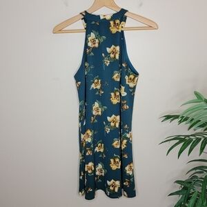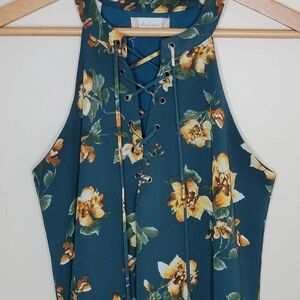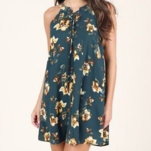 Altar'd State | Dark Teal & Tan Floral Print Lace-up Trapeze Mini Dress Medium