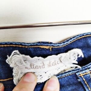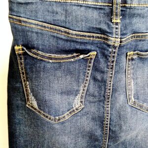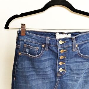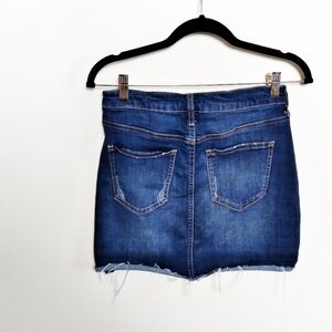 Altar'd State medium wash denim button up mini skirt with 3 front pockets and 2 back pockets and a raw hem.