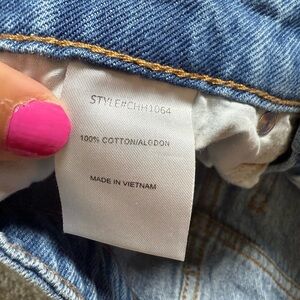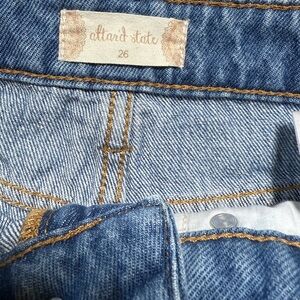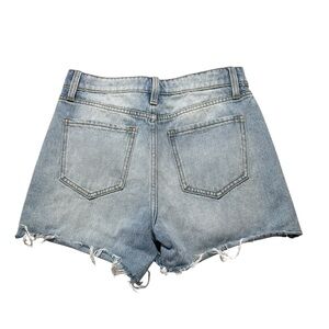 Altar’d State distressed denim shorts, size 26. Classic blue wash with heavy distressing, frayed raw hems, and a cheeky high-rise cut. Made from 100% cotton for that vintage, no-stretch denim feel. Features button and zip closure, five-pocket design, and tons of cool-girl attitude.