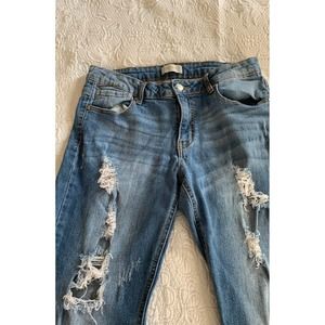 Very distressed size 28 jeans. These are distressed in all the right places. They also have lots of stretch to them. They are 99% cotton and 1% spandex