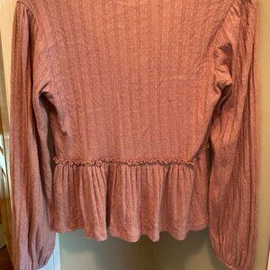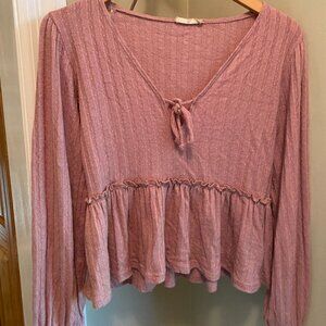 Altar'd State dusty rose/mauve-colored v-neck lightweight sweater with a tie sweater and a peplum hem. Very soft!