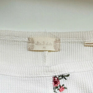 Altar’d state white rose embroidered waffle knit cropped top. In excellent condition! Crew neckline. Long sleeves. Small slits on the hem. Slightly cropped. Soft waffle knit thermal material. Off white color with small pink/red embroidered roses. Size xsmall.