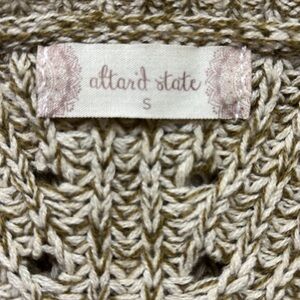 Light tan & tan colored sweater with a cream eyelet ruffled hem