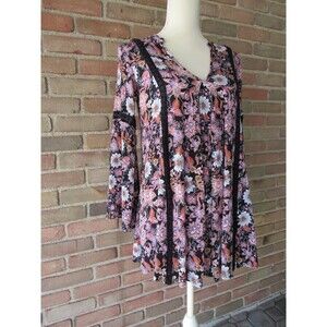 Altar'd State Floral Black Pink Babydoll Boho Mini Dress Bell Sleeve Size XS