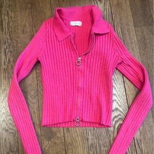 Fuchsia ribbed cardigan with zip-up front. Features a classic collar.