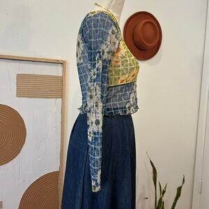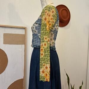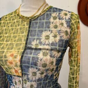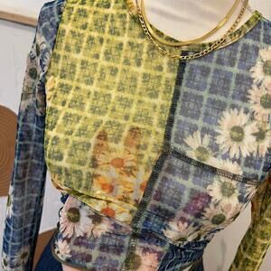 Altar'd State Green & Blue Patchwork Daisy Floral Semi Sheer Cropped Top USA S