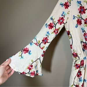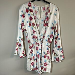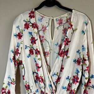 Altar’d State women’s cream and floral embroidered long sleeve romper. Double lined with shorts, but the top half has only single layer of fabric.