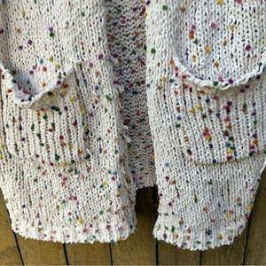 Creamy white knit cardigan with rainbow speckled confetti design all over