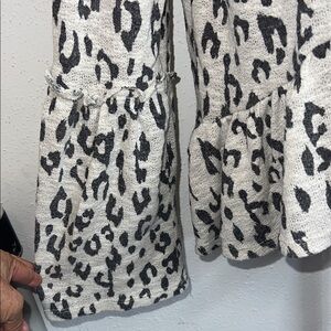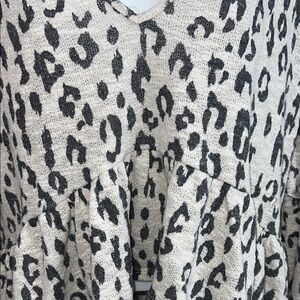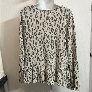 Chic leopard print blouse with a V-neckline. Features stylish ruffle details.