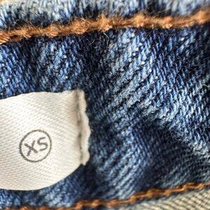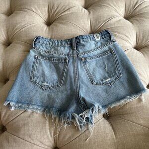 Trendy light blue jean shorts with a frayed hem. Distressed details for a chic look. Ideal for casual wear.