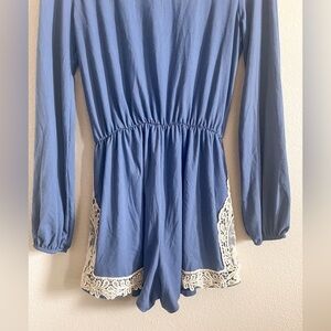 Excellent condition Altar'd State baby blue long sleeve shorts romper. This casual yet fun romper features elastic waist, soft and stretchy material, and lace crochet detailing along shorts.