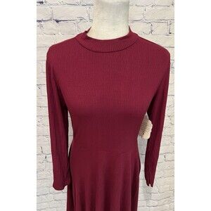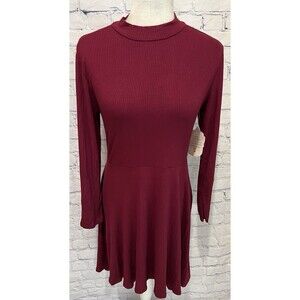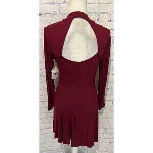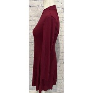 The Altar'd State Long Sleeve Mini Dress is a stylish and versatile piece perfect for the winter, fall, and spring seasons. This maroon dress features a mock neck and long sleeves, with an open back detail that adds a touch of allure. Made from a blend of spandex and rayon, this fit and flare dress is designed for a comfortable fit and flattering silhouette. The solid pattern and ribbed accents give it a modern and chic look, making it a must-have addition to any woman's wardrobe. 17 inches pit to pit, 26 inch waist and 35 inches long. Smoke free home.