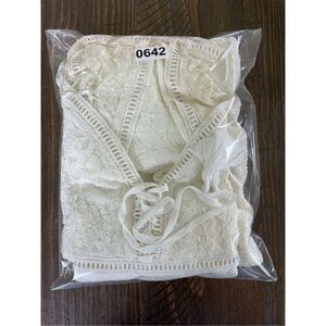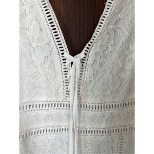 Romantic and flowy, this Altar’d State white maxi dress features a boho lace bodice, tassel ties, and a flowy chiffon skirt. The back cutout and intricate lace details make it perfect for bridal showers, beach weddings, or formal summer events. There is minor discoloration on the lace under the front ties and a small stain near the back hem—see photos. Otherwise in beautiful condition. Please see photos for measurements.
