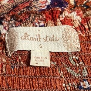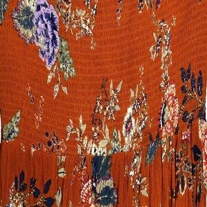 Altar’d State Merida Floral Smocked Off The Shoulder Maxi Dress Small #KA18432. Brown/burnt orange boho floral with tiered ruffle sleeves. Adorable and in great condition see photos for details. 100% rayon. Approximate measurements 50” length from top of bodice 12” width across bust laying flat unstretched. There is quite a bit of stretch in the bodice - I pulled to about 17”. So will fit range of bust sizes depending on how you like fit.