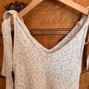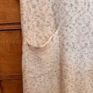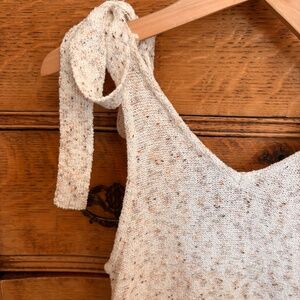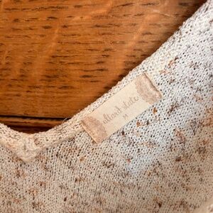 This altard state dress is the perfect summer statement! It is a beautiful cream color with goldish/tan speckles throughout. It is made of a quality terry/knit material. It has tie shoulders perfect to adjust to your body. It features two pockets on the front for intentional detail and a small slit on each side of the skirt. This could be a casual summer brunch dress or even a cover up at a resort! This dress is sized medium but could definitely fit small as well.