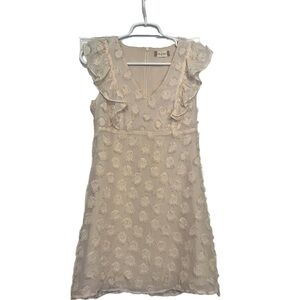 Altar’d State - Lined Mini Dress V-Neck, Ruffled cap sleeved with raised tufts/3D effect The dress is a light cream color with a V-neck and ruffled cap sleeves. It features a textured pattern consisting of small, raised tufts all over the dress, creating a 3D effect. The dress falls above the knee, giving it a playful yet elegant look.