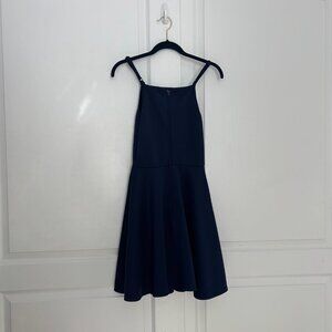 Navy fit-and-flare mini dress with subtle open-stitch detailing and adjustable straps. Sleek and structured—perfect for brunches, parties, or a night out.