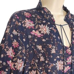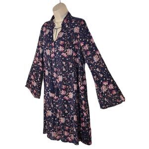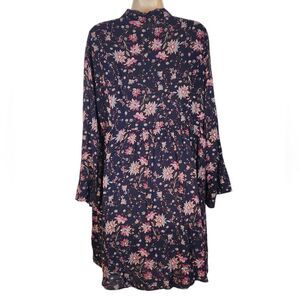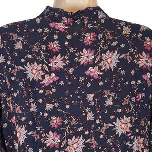 Chic navy dress with vibrant floral pattern. Features long sleeves and a tie neckline. Perfect for any occasion.