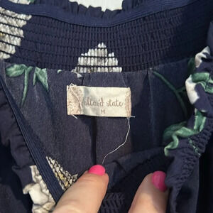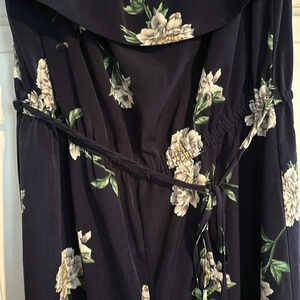 Stylish navy jumpsuit with floral pattern. Features ruffled off-shoulder design. Perfect for casual outings.