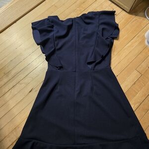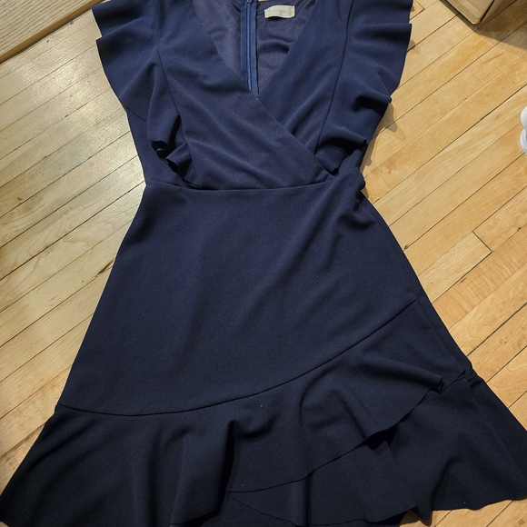 Chic navy mini dress with ruffle details. Wrap style for a flattering fit. Ideal for any event.