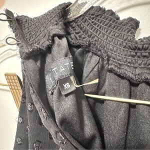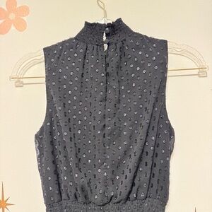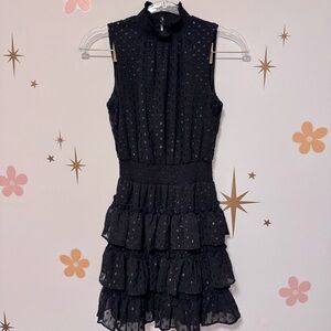 Elegant black mini dress with ruffled skirt. Sleeveless and textured design. Super cute, only worn once so like new.
