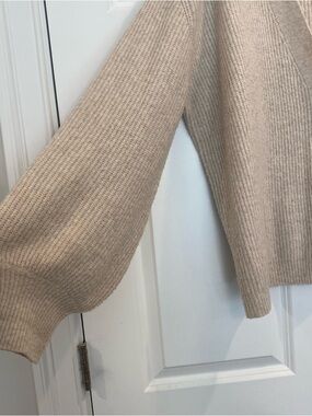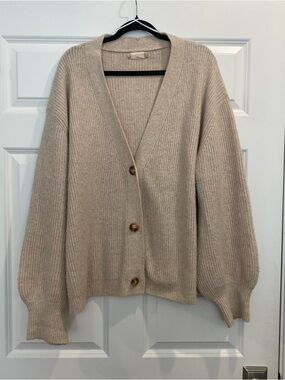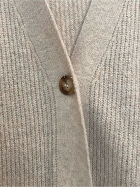 Lightweight ribbed cardigan with a relaxed silhouette. Deep V-neck and three marbled buttons for easy closure. Soft neutral beige tone ideal for layering. Cozy cuffs and a slightly oversized fit.