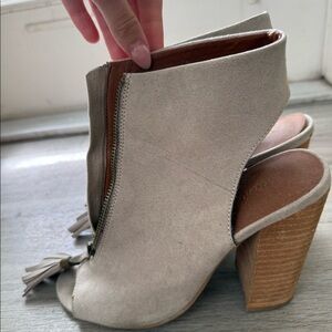 Lightly used heel booties in light taupe brown/grey color. suede material with bohemian tassle zipper. $10 OBO