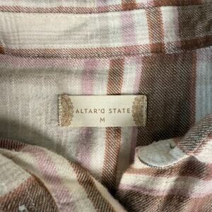 Altar'd State Oversized Brown and Pink Plaid Button-Up Blouse - Medium - perfect blend of cozy and classic - warm mix of tan, cream, and soft blush tones - long-sleeve - easy to style for fall layering or year-round casual looks - excellent pre-owned condition!