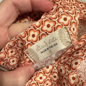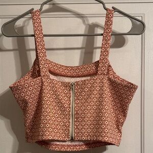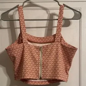 Elevate your style with this chic geometric patterned top. Featuring a vibrant coral and burnt orange design, it's perfect for a summer picnic or going to a festival! Does not have any stretch or shoulder strap adjustments, does zip in the back to get it on and off.