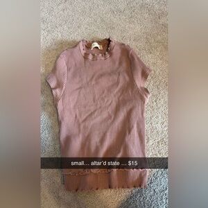 Discover the elegance of the Altar'd State Pink Ribbed Ruffled Blouse, a perfect blend of style and sophistication. This blouse features a delicate ruffle detail around the high neckline, adding a touch of femininity to its ribbed texture. Crafted in a soft pink hue, it offers a fitted silhouette that complements any wardrobe. Ideal for both casual and formal occasions, this blouse is a versatile addition to your collection.