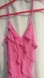 Elegant pink maxi dress. Features cascading ruffles. Perfect for special occasions.