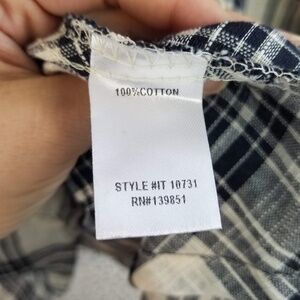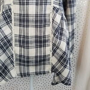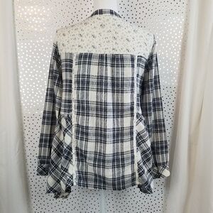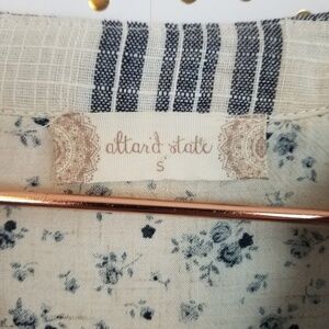 Altar'd State mixed media top. Split neck mandarin collar. Blue and white plaid with floral print fabric details. Gathered panels on the sides. Size Small. 100% Cotton.