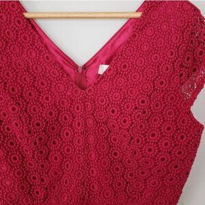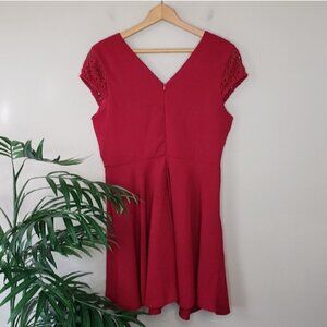Beautiful cherry red A-line dress with crochet lace upper. Back zip, lined.
