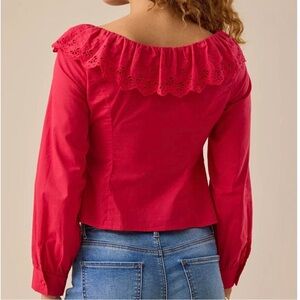 Chic red blouse with ruffled neckline. Features eyelet details and long sleeves. Ideal for a trendy look.
