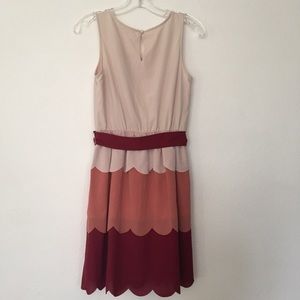 Cute tan/blush dress with different color ruffle layers in the skirt. Peephole in back. Ribbon in belt loops, not seen in. Can be tied however. Super cute!! All offers welcomed plus discounted shipping on bundles ;)