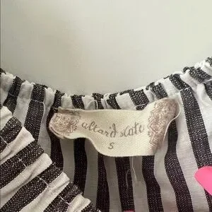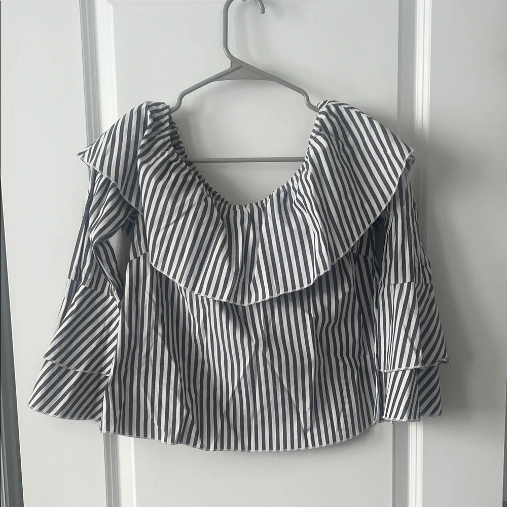 Elevate your style with this chic striped ruffle off-shoulder top. Cute bell 3/4 sleeves. Perfect for any occasion, this black and white top adds a touch of elegance to your wardrobe. Size small.