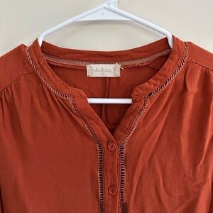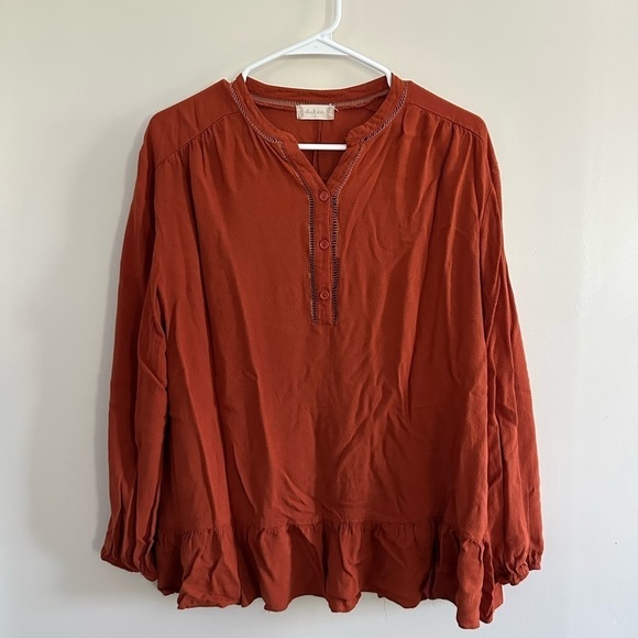 Altar’d state blouse, in great condition, just a little wrinkly since it’s been in my drawer. This top is very Boho! Henley-neck, Ruffle details on bottom of shirt. Wrist areas are elastic. Cute fall color blouse!