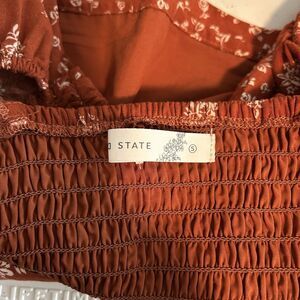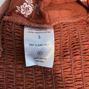 Charming rust crop top with floral pattern. Features puff sleeves and a sweetheart neckline. Perfect for casual outings.