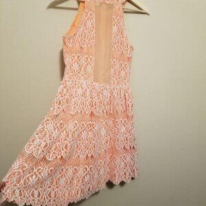 Altar'd State Small orange and white crocheted Halter mini dress. Sleeveless. Mesh back panel with back zip. Fit and flare style.