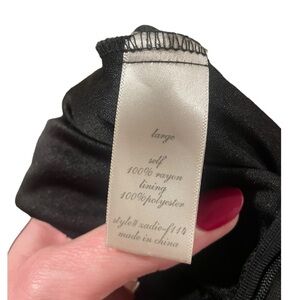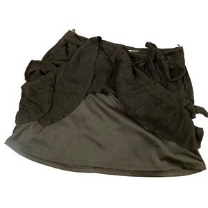 Black miniskirt, inner lining, belt can be tied in the middle or on the side, back zipper, faux wrap, ruffle