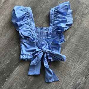 Elegant sky blue tie-back cropped blouse with ruffled straps. Smocked bodice for a flattering fit. Comes with hanger straps. NWOT. Feel free to ask any questions; offers always welcome. Bundle two or more items and save!
