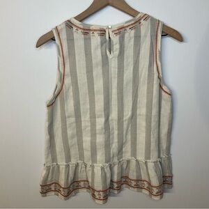 Altar’d State Sleeveless Gray and White Striped Embroidered Ruffle Peplum Tank Top, Size Large.